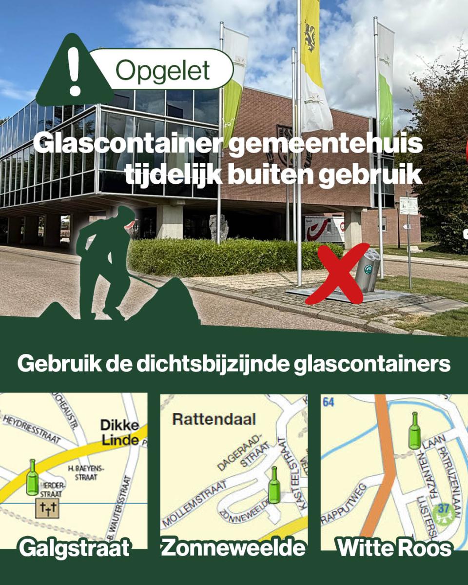 Door omgevingswerken aan het gemeentehuis is de glascontainer tijdelijk buiten gebruik.
