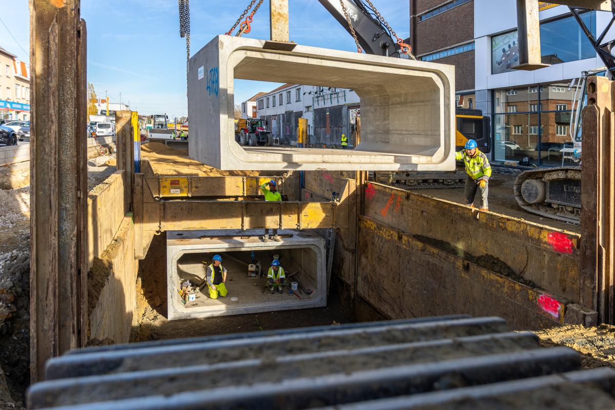 Het stuk van de Bergensesteenweg waar momenteel gewerkt wordt, ligt in overstromingsgevoelig gebied. Dat is de reden waarom de kokers zo groot zijn en waarom er een mobiele telescoopkraan van tachtig ton gebruikt wordt. Het plaatsen zelf is een technisch uitdagende klus: er kunnen iedere dag maar drie kokers geplaatst worden.